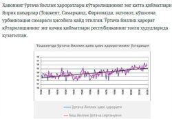 Ҳавонинг ўртача йиллик ҳарорати кўтарилишининг энг катта кўрсаткичи Тошкент, Самарқанд, Фарғона каби йирик шаҳарларда қайд этилган. Бунга қўшимча урбанизация ҳам таъсир этган бўлиши мумкин.