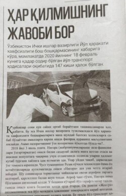 Наманган вилояти ИИБ Йўл ҳаракати хавфсизлиги бошқарма бошлиғи Б.Д. бир инсон ҳаётига зомин бўлди (“Ҳуқуқ”, 5 март). У Чуст тумани Резак кўчасида кетаётган аёлни босиб кетган. Аёл оғир жароҳатдан шифохонада вафот этган. Маълум бўлишича, ЙҲХБ бошлиғи Б.Д. ўзига бириктирилган хизмат машинасида ўзбошимчалик билан, раҳбариятни огоҳлантирмай Тошкентга борган. Чарчагани ва уйқу элитаётганига қарамай рулга ўтирган ва пойтахтдан қайтаётганда ушбу фожиа рўй берган. Қайд этилишича, ИИБ мансабдори терговда ёлғон кўрсатма бериб, сувдан қуруқ чиқишга уринган. Аммо бош прокуратура олиб борган терговда пировардида ҳақиқат юзага чиққан. Марҳуманинг яқинлари айбланувчи улардан узр сўрагани, дафн маросими харажатлари ва бошқа моддий зарарларни қоплагани учун суддан енгиллик сўраган.