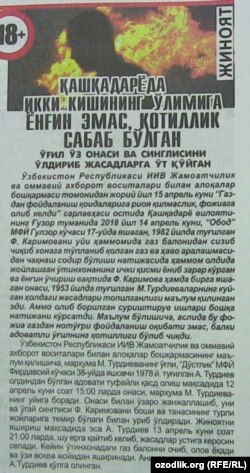 Фарғоналик аёл “шармандали иш”га қўл урган қизини жаҳл устида ўлдирди. Тошкентда милиция инспектори ўзига маъшуқа бўлишни рад этган аёлга қўл кўтарди. Қашқадарёда икки киши ўлимига сабаб бўлган ёнғин қотиллик изини яшириш учун уюштирилгани аниқланди. Жорий ҳафта матбуот шу каби воқеалар ҳақида хабар берди.