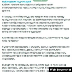 Блогер Ферузхон Ёқубхўжаев Телеграмдаги саҳифасида дронлар хавфли экани ҳақидаги фаразларни “аҳмоқона” деб атаган. “Учувчисиз бошқариладиган фуқаровий қурилмаларга оид ваҳима ва жазаванинг боиси нима эканини ҳеч тушуна олмадим. Наҳотки, бутун бошли ҳукуматда кучишлатар тузилмаларнинг ялпи васвасаси таъсири тушмаган маърифатли инсонлар топилмаса?” деган Ф. Ёқубхўжаев.