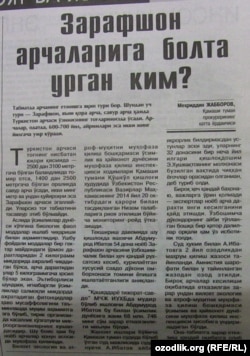 Қашқадарё вилояти Қамаши тумани Қўшкўл қишлоғи ҳудудида табиатни муҳофаза қилиш бошқармаси ўтказган рейдларда ноёб арчаларни кесиш ҳоллари аниқланди (“Ҳуқуқ”, 7 сентябрь). Масалан, шу қишлоқлик Абдумурод Ибатов 54 дона ноёб Зарафшон арчасини ўзбошимчалик билан кесиб, дўкони томини ёпишга ишлатган. “Қашқадарё тижорат-савдо” фирмасида мудир бўлиб ишлаган А.Ибатовнинг ўсимлик дунёсига келтирган моддий зарари 68,7 миллион сўм деб баҳоланган. Жиноят ишлари бўйича Қамаши тумани суди А.Ибатовни 2 йил озодликдан маҳрум этган. Айни чоқда, унга амнистия қўллангани хабар қилинган. Бир неча юз йил яшайдиган Зарафшон арчаси ноёб ўсимликлар сирасига киради ва усиз тоғ табиатини тасаввур қилиб бўлмайди, деб ёзади прокуратура нашри.