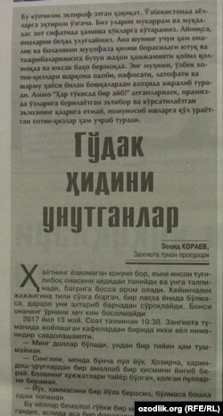 Ҳудудда яна бир чақалоқфурушлик жинояти фош этилган. Турмуш ўртоғидан ажрашган, уч фарзанднинг онаси бўлган аёл ишлаш учун Жиззахдан Тошкентга келади ва орадан кўп ўтмай ҳомиладор эканини билиб қолади. Тўртинчи фарзандини дунёга келтиргач, уни 1200 долларга сотаётганда қўлга олинган. “Ҳадемай, икки қизалоқ ҳам вояга етади, ақлини танийди. Аммо ўшанда ўз жигаргўшасини сотмоқчи бўлган оналар фарзандларининг кўзларига қарай олармикан? Энди улар бир умрлик виждон азоби билан яшашга маҳкум”, деб ёзади Зангиота тумани прокурори З.Қораев.