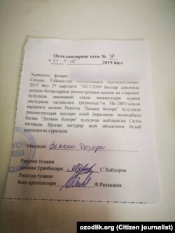 Ҳокимлик баёнотида Озодликнинг фоторепортажида тилга олинган ҳолатлар: бозор ёнидаги ҳовли-жойлар бозорни кенгайтириш учун, туман марказини кесиб ўтувчи катта йўл бўйидаги уйлар эса, йўлни кенгайтириш учун бузилаётгани ҳамда "Деҳқон бозори" реконструкцияси бошланаётгани тасдиқланди.