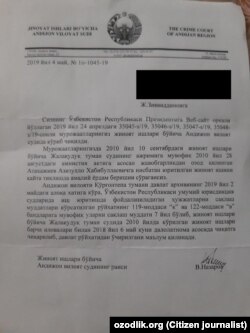 ТЎРАҚЎРҒОН. “Мен – Ж.Зиёвиддинов, Наманган вилояти Тўрақўрғон туманидан ёзмоқдаман. “Адолат қўрғони” адвокатлар ҳайъати адвокатиман. Азизулло Атахажиевга нисбатан ЖКнинг 208- ҳамда 189-моддалари билан қўзғатилган жиноят иши Жиноят ишлари бўйича Жалақудуқ тумани суди томонидан 2010 йил 9 сентябрда кўриб чиқилган ва амнистия актига кўра судланувчи жазодан озод этилган. Ушбу ажрим юзасидан келтирилган кассация шикояти 2017 йил 2 ноябрда жиноят ишлари бўйича Андижон вилояти суди томонидан ўзгаришсиз қолдирилган. Иш юзасидан асосланган далиллар асосида Олий судга ёзган шикоятимиз эса умуман ўрганилмасдан судья А.Аллаев томонидан рад этилган. Биз муқаддам эълон қилинган жиноят иши жиноят қонунчилиги ўзгаргач, жиноят иши ҳисобланмайди деб биламиз. Шу боис бу борада ЖИБ Олий суд судлов ҳайъати раисига илтимоснома киритдик. Ҳайъат раиси эса жиноий иш архивда йўқ қилинганини таъкидлади. Биз Олий cуддан жиноят ишлари бўйича Жалақудуқ тумани судининг Азизулло Атахажиевга нисбатан 2010 йил 9 сентябрдаги ажримини бекор қилиниши ва оқлов ҳукми чиқарилишини сўраймиз”.
