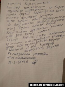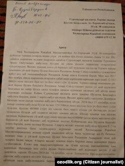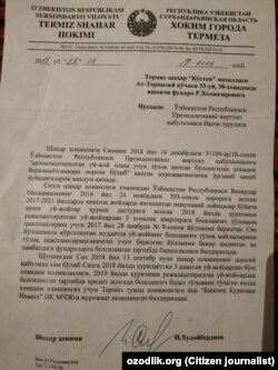 Термиз шаҳри ҳокими, вилоят ҳокими, вилоят хотин-қизлар идораси раҳбари қабулига ойлаб қатнадим. Вазирлар Маҳкамаси, Бош прокуратурага шикоят ёздим. Аввалдан қилган тўловим асосида Термиз тумани Аму мавзесидаги арзон уй-жойлардан ажратиб беришларини сўрайман”.