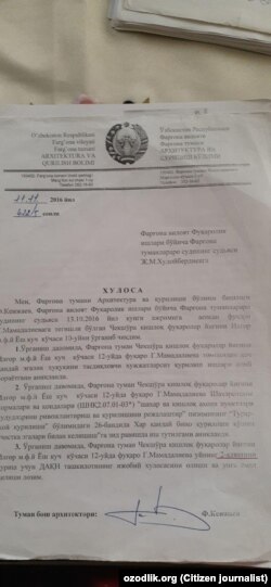 Бизга қўшни саналган 12-уйнинг иккинчи қавати – мансарда қисми ноқонуний равишда қурилгани суд томонидан тасдиқланган. Фуқаролик ишлари бўйича Фарғона туманлараро судининг 2019 йил 18 январдаги ҳал қилув қарори билан жавобгар, мулк эгаси Г.М.га уйининг ноқонуний қурилган иккинчи қаватини бузиш юкланган. Бу орада Г.М. қарор ижросини кечиктириш ҳақида ариза берган. Пировардида, ушбу масала Олий суд даражасида кўрилиб, энг юқори инстанция 2019 йил 3 июнда ижро ҳаракатларини давом эттириш ҳақида кўрсатма берган. Ажабланарли жиҳати, вилоят ва туман мутасаддилари Олий суд кўрсатмасига ҳам беписандлик қилиб келмоқда.