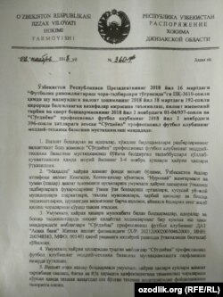 Озодлик Жиззах вилояти ҳокимининг “Сўғдиёна” футбол клуби учун пул йиғиш акцияси борасидаги фармойиши нусхасини қўлга киритди. Вилоят