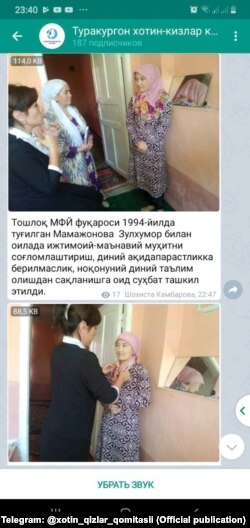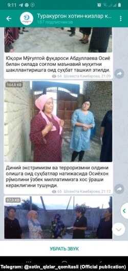 Тўрақўрғон хотин-қизлар қўмитаси Telegram каналида берилган фото-хабарларда ҳижоб ўраган бир неча аёлнинг рўмолини орқасидан ўрай бошлагани айтилган.