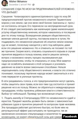Суд қарор чиқаришни биринчи марта кечиктирган 2 декабрь куни ëзган шарҳида Илҳомов¸ ўзбекистонлик тадбиркорларнинг ўз қонуний ҳақ-ҳуқуқини ҳимоя қилиши учун мавжуд халқаро механизмларни ҳам тилга олиб ўтган эди.