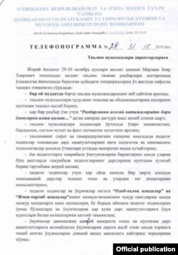 Жумладан, Қашқадарё вилоятининг касбий таълимни ривожлантириш ва мувофиқлаштириш ҳудудий бошқармаси томонидан таълим муассасаларига йўлланган Телефонограмма Озодликка келиб тушди.